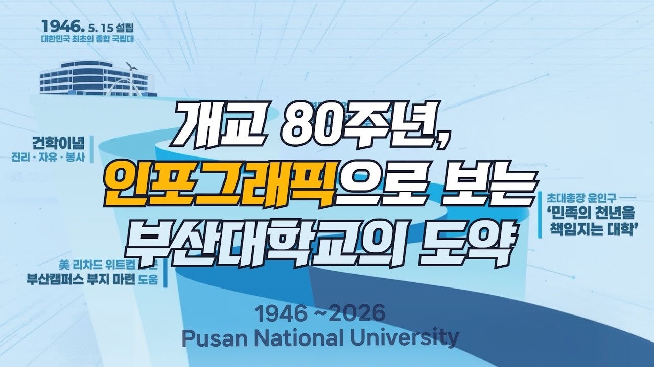 1946년 대한민국 최초의 종합 국립대학으로 출범한 부산대학교는2026 QS 세계대학평가 국내 국립대 1위에 오르며글로벌 경쟁력을 갖춘 국가 거점 국립대학으로 성장해 왔습니다.교육과 연구, 산학협력, 국제 교류를 통해 축적해 온부산대학교의 주요 성과와 글로벌 활동을인포그래픽으로 한...